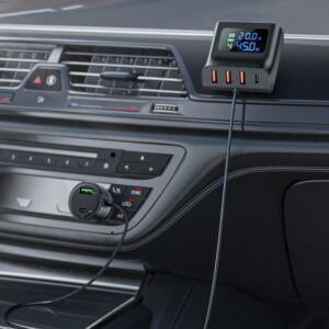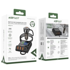 The Acefast B11 fast car charger has 4 USB-A connectors and 2 USB-C connectors. The digital screen displays the current power and voltage of the ports in real time. It operates with a power of 138 W divided into all ports. Works with all popular car and truck brands.