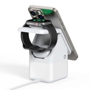 - Allows you to charge three devices simultaneously, eliminating the need for multiple chargers and cables. The station charges iPhone, Apple Watch and AirPods simultaneously. It can also be used as a phone stand and desk lamp.