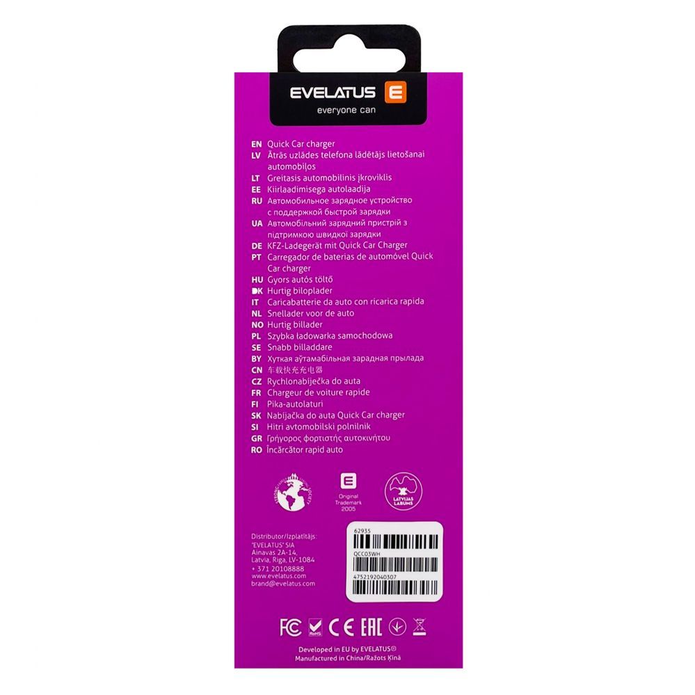 Autolaadijad Evelatus – Evelatus Quick Car Charger QCC03, QCC03WH White