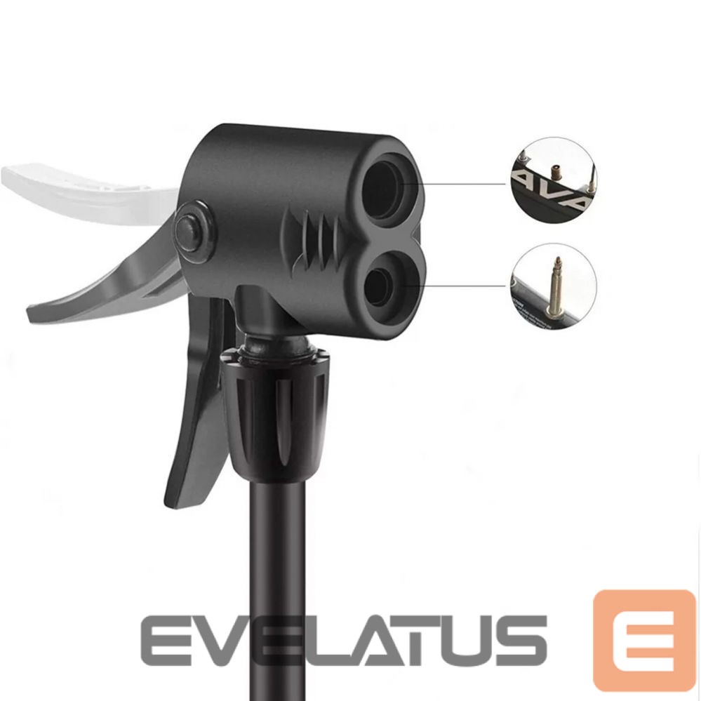 We present the Rockbros 42610002001 bicycle pump – an irreplaceable tool that will work in any situation. It has a double head with a built-in lock and is compatible with Presta and Schrader valves. The built-in pressure gauge allows you to precisely control the pressure. The foldable footrest and rubber pad increase comfort of use, ensuring stability during inflation.