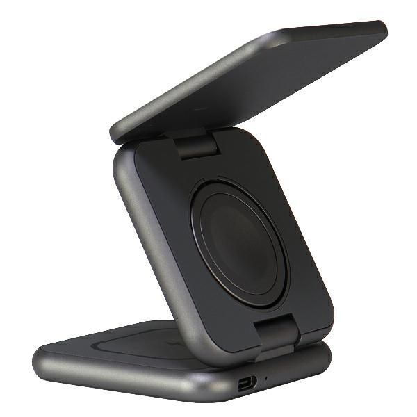 Thanks to this charger, you can charge three devices at the same time, and its foldable, compact housing allows you to take the charger anywhere. The small size allows you to put it in your hand luggage or in your clothes pocket. When unfolded, the charger also serves as a base for the phone, enabling convenient and stable mounting of the phone in a vertical position.