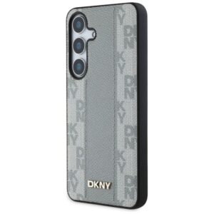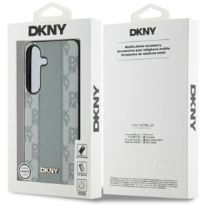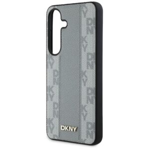 Każde etui zostało ozdobione unikalnym wzorem inicjałów marki DKNY, które układają się w efektowny geometryczny motyw kratki. Ten charakterystyczny wzór przyciąga uwagę swoją niepowtarzalnością i wyjątkowym designem. Dodatkową ozdobą jest szeroki, pionowo ułożony pas utrzymany w kolorystyce pokrowca, co tworzy spójną i elegancką całość. Projekt zwieńcza niewielkie logo marki DKNY, które podkreśla prestiż i autentyczność tej kolekcji.