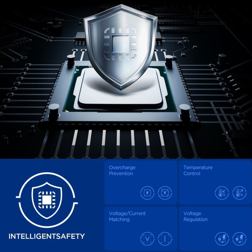 Quantum Boost technology automatically adjusts charging power to match connected devices, maximizing their efficiency. Built-in Overcharge Prevention, Voltage Matching, and Voltage Regulation features protect devices against overcharging, excessive voltage, and unstable current, ensuring safe and stable charging in all conditions.