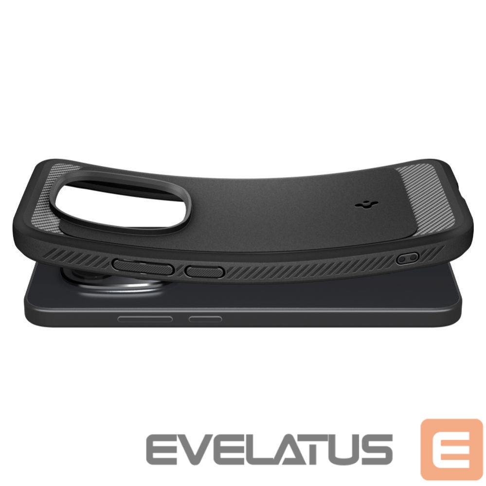 The flexible Spigen Rugged Armor case features a modern, carbon-fiber texture. Its slim design fits perfectly around the phone without altering its original silhouette.