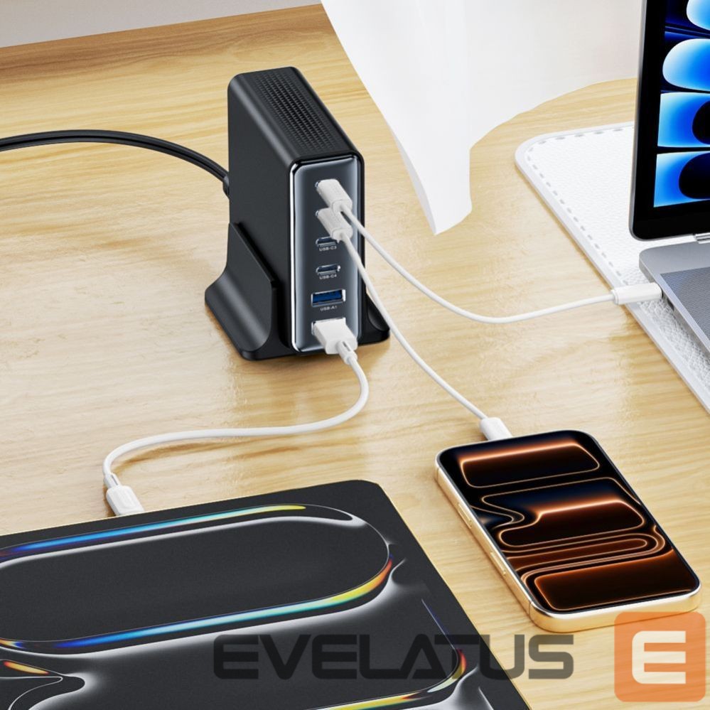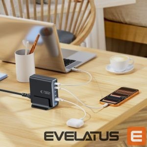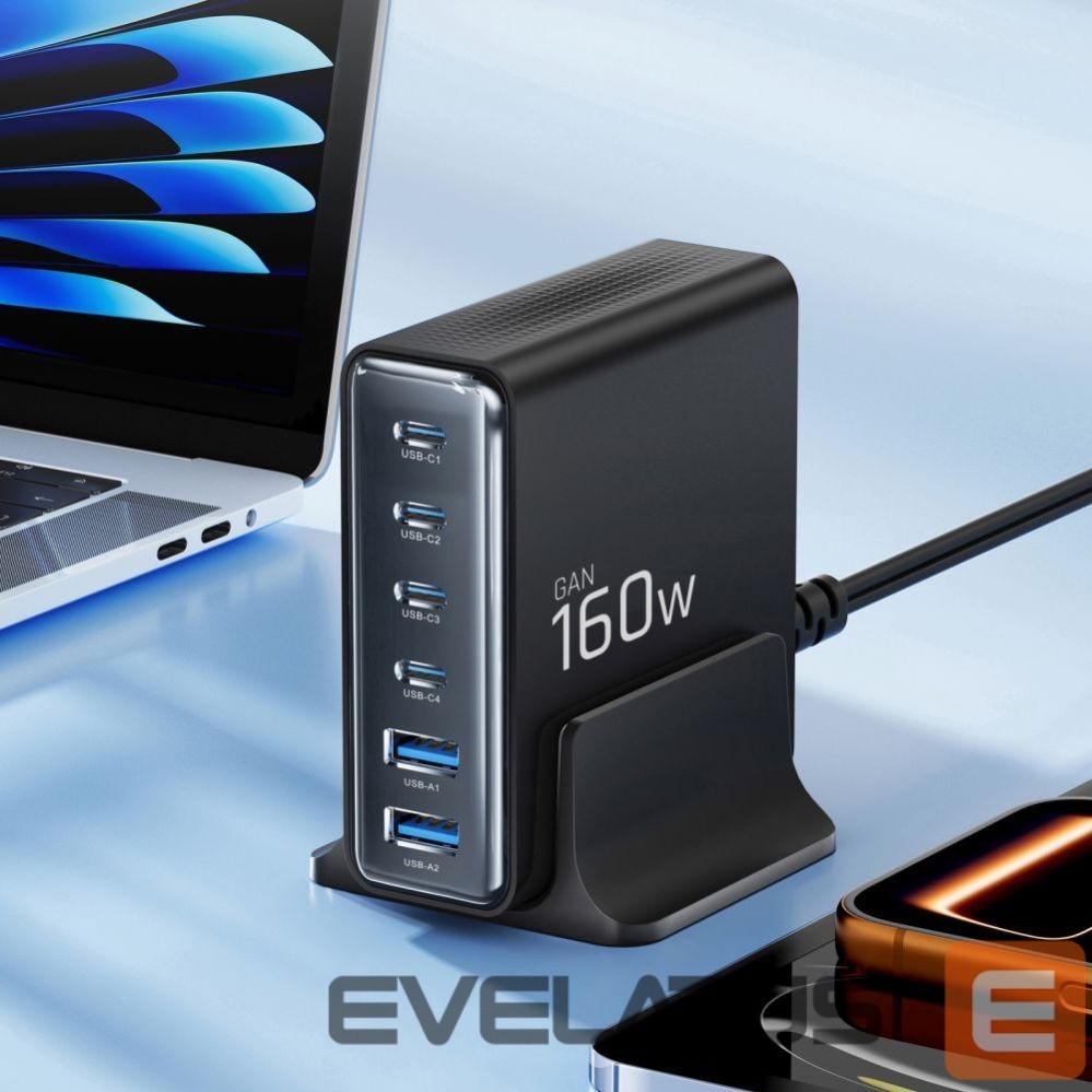 The Tech-Protect DC160W-GAN desktop charger is a practical solution utilizing GaN (gallium nitride) technology, offering 160W of power in a stationary charging station. With six charging ports, you can simultaneously power your laptop, tablet, smartphone, wireless headphones, smartwatch, and additional accessories while keeping your desk tidy.