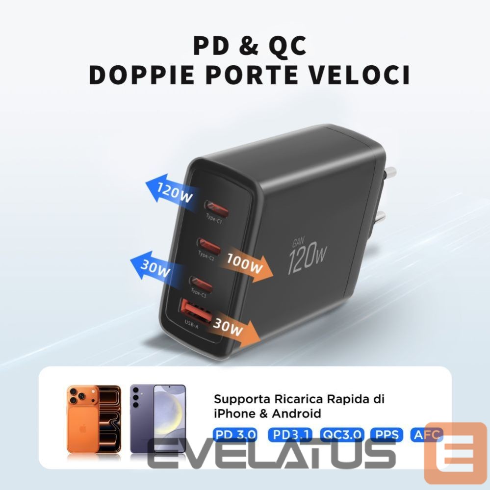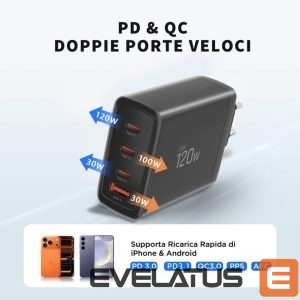 Equipped with three Type-C ports and one USB-A port, the charger offers maximum versatility. The two main Type-C ports each support 100/120W of power, allowing for lightning-fast charging of even the most demanding devices, such as MacBooks and gaming laptops. An additional Type-C port and a USB-A port provide up to 30W of power, ideal for smartphones and accessories.