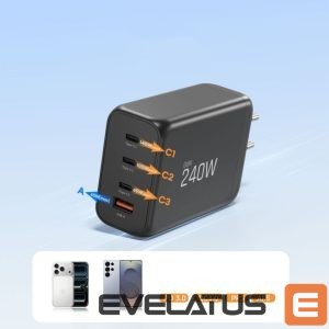 The Tech-Protect NC240W-GAN AC Charger is an advanced device utilizing GaN (gallium nitride) technology, offering 240W of power in a compact package. With four charging ports, you can simultaneously power your laptop, tablet, smartphone, and additional accessories at full capacity.