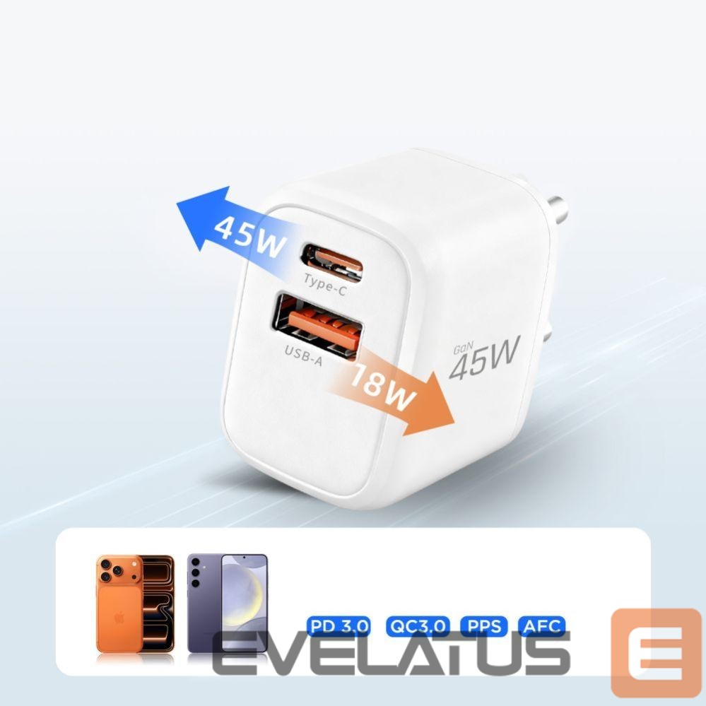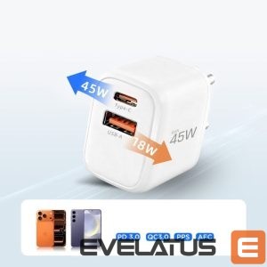 The Tech-Protect NCA45W-GAN is a powerful wall charger with advanced GaN technology, designed to quickly power two devices simultaneously. It comes with a 1-meter USB-C to Lightning cable with 27W output, providing a complete fast-charging solution for Apple devices. The Type-C port with Power Delivery 3.0 delivers up to 45W of power, ideal for laptops, tablets, and smartphones, while the USB-A port with Quick Charge 3.0 offers up to 18W for older devices.