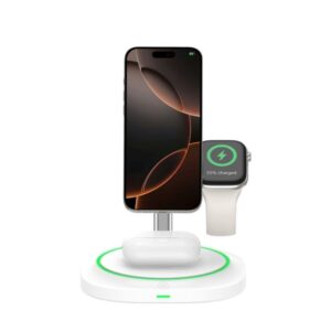 Tech-Protect QI15W-A46 – a modern, magnetic 3-in-1 wireless charger, created for users who value comfort and aesthetics. Thanks to support for MagSafe technology and the ability to charge three devices simultaneously, it is an ideal solution for the office, bedroom or living room. The charger supports fast charging with a power of up to 15W for smartphones, 2.5W for smartwatches and 3W for headphones, and compliance with PD and QC3.0 protocols ensures stable and efficient power supply for devices.
