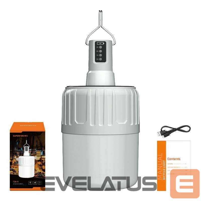 The T26-S camping lamp is extremely lightweight and portable – it can accompany you almost anywhere. It won’t take up too much space in your backpack or travel bag! It will be perfect for camping and more. Its additional advantage is a special hook, with which you can, for example, hang it on a tree or in a tent. The device also has a built-in display that will provide you with information about its charging status.