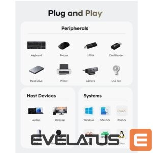 Cudy UH40A on kiirete USB 3.0 hub 4 Type-A portiga, mis on mõeldud teie sülearvuti või lauaarvuti ühenduvuse suurendamiseks. Stiilse ja kerge disainiga pakub see andmeedastuskiirus kuni 5 Gbps, muutes selle ideaalseks USB mälupulkade, välistest kõvaketastest, klaviatuuride, hiirte ja muude USB perifeersete seadmete jaoks.