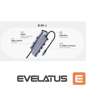 Ruuterid Cudy UH606 PortMate USB-C 6-in-1 Hub 4K 60Hz HDMI Gigabit LAN 3x USB-A Power Input Grey