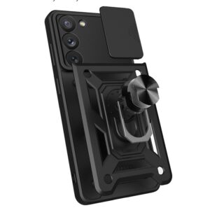 The Hybrid Armor Camshield case is made of a thermoplastic and durable material that looks like steel. The cover is tailored to the Samsung Galaxy S23+ , perfectly protects the phone against damage due to falls or scratches (for example, by keys carried in a pocket). The cover has a sliding cover for the rear camera. Thanks to it, the camera glass is protected from scratches. There is also an additional plus for people who value privacy and security of their data. Covered camera prevents access to video recording in case someone gains remote access to the phone and turns on the preview from the main camera. The raised edges around the screen protect it from scratches when it is placed on a flat surface. It has a built-in metal ring that allows you to conveniently use the phone with one hand and also functions as a stand. The built-in metal plate makes it possible to attach it to magnetic car holders. It has responsive buttons and cutouts for ports. Perfect for people who value style, quality and want to take care of their device.