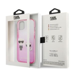 The unconventional case is decorated with Karl's avatar, characteristic of the Ikonik fashion collection, highlighted by a pink gradient background.