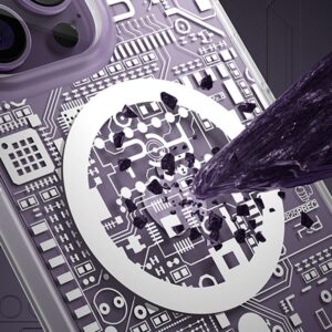 Something for a real geek! This transparent smartphone case is inspired by the texture of a printed circuit board. Made of solid plastic, effectively protects the device against the effects of falls. Supports MagSafe technology, making wireless charging possible. Metal buttons in a contrasting color make this case look very modern. The cover is adapted to the iPhone 14 , perfectly protects the phone against damage due to falls or scratches (for example, by keys carried in a pocket). Raised edges around the screen and rear camera protect the phone from scratching these elements when it is placed on a flat surface. It has responsive buttons and cutouts for ports. Perfect for people who value style, quality and want to take care of their device.