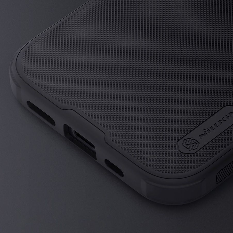 The Nillkin Super Frosted Shield Pro series case is a very durable cover that is able to protect your phone from serious damage after it falls to the floor. When buying a new phone, it is worth getting a decent case right away, especially when you have decided on a device from the highest price range. One careless movement is enough for the phone to fall to the ground. The cover consists of a flexible TPU frame and rigid PC backs. The frame makes it easy to put the case on the phone, and the backs stiffen the entire structure. The corners are shaped in such a way that they act like bumpers in the car and absorb impact energy. Raised edges around the rear camera and screen separate these elements from the ground where they could be scratched.