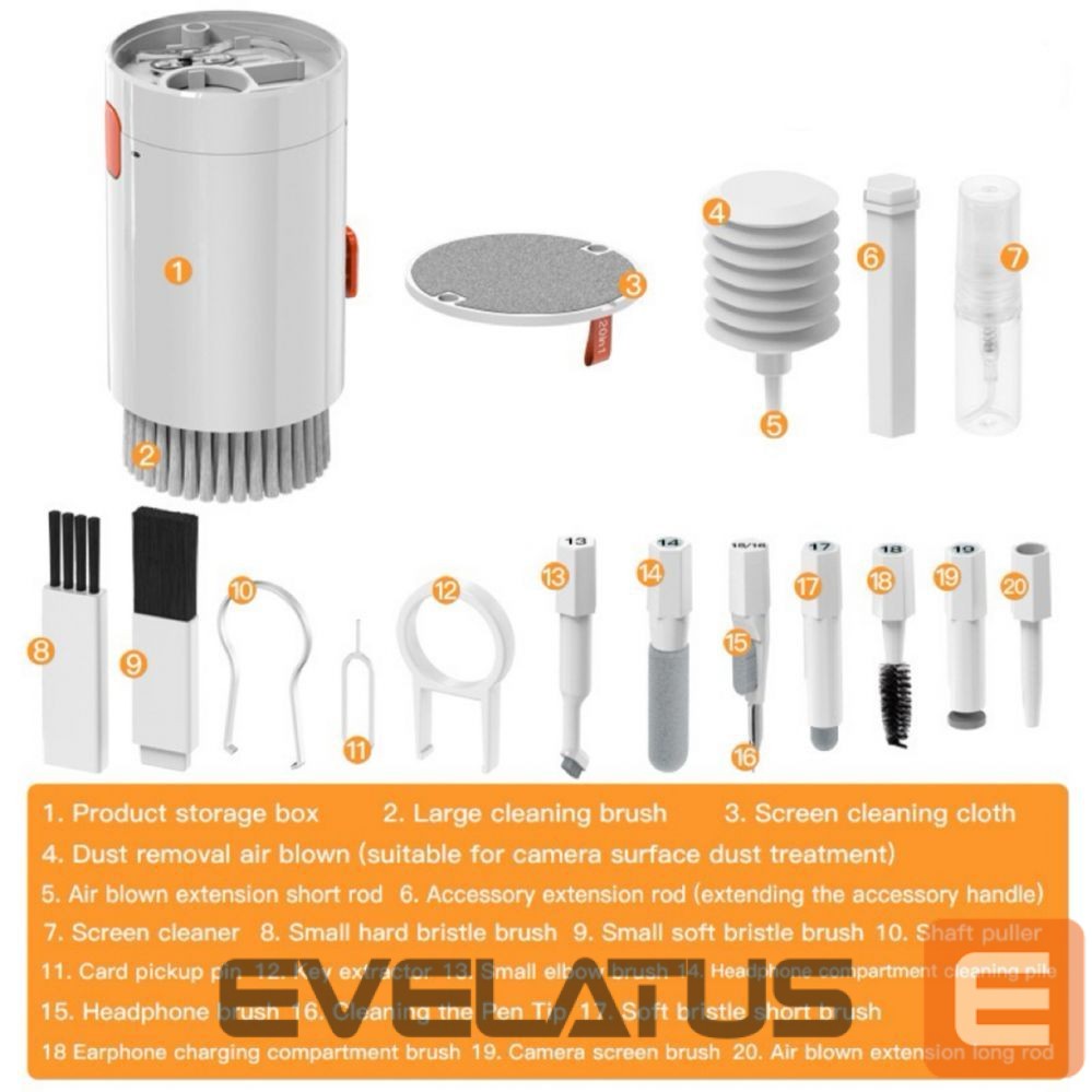 • Versatility: The set contains as many as 20 elements that allow for thorough cleaning of a variety of surfaces and devices – from screens, through headphones, to keyboards.