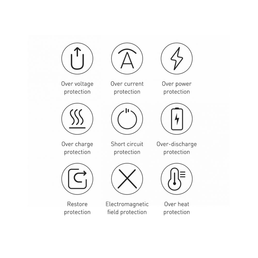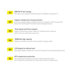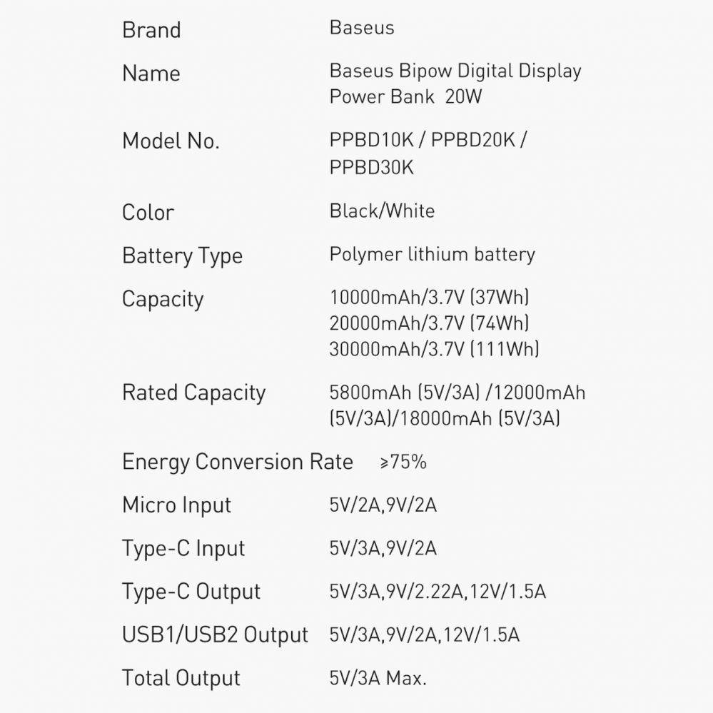 • Outputs: USB1/USB2 18W (5V/ 3A, 9V/2A, 12V/1.5A); USB-C 20W (5V/3A, 9V/2.22A, 12V/1.5A)