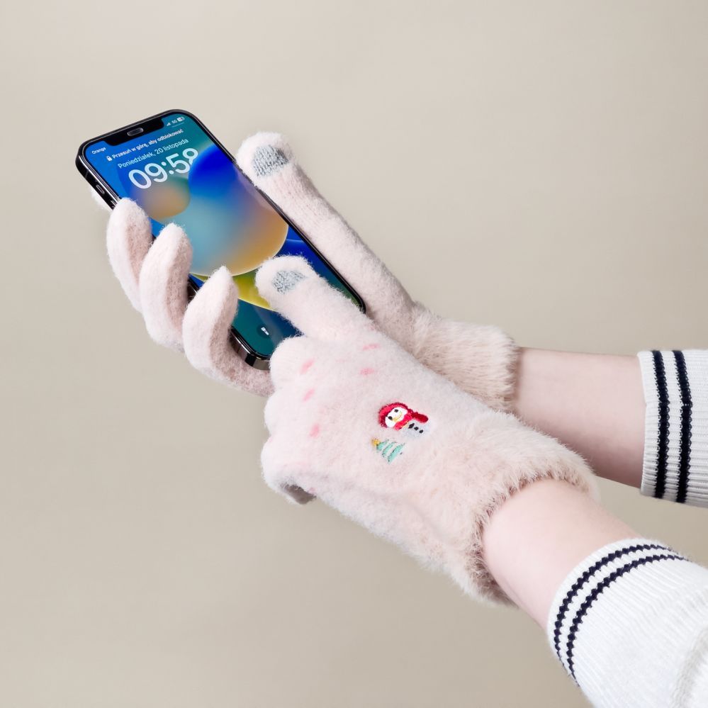 Women's winter telephone gloves with a snowman and a Christmas tree – beige