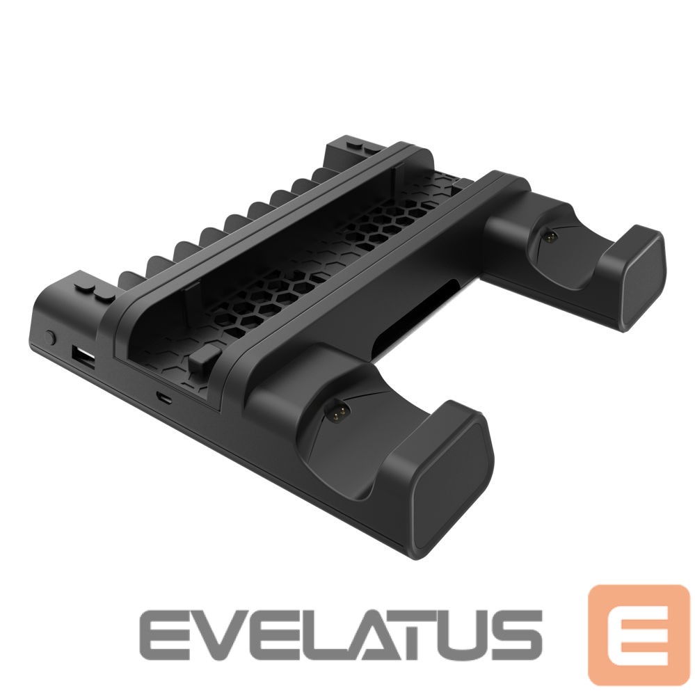 This sleek, black multi-functional station efficiently cools your PS4 console while simultaneously charging two controllers.