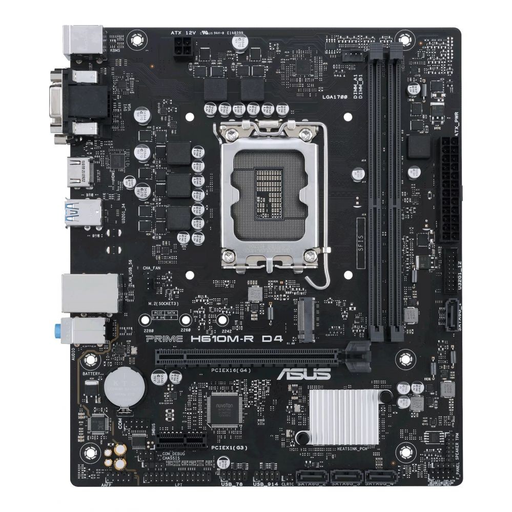 Motherboard for Intel processors Asus PRIME H610M-R D4-SI Processor family Intel, Processor socket LGA 1700, DDR4 DIMM, Memory slots 2, Supported hard disk drive interfaces SATA, M.2, Number of SATA connectors 4, Chipset Intel H610, Mic-ATX