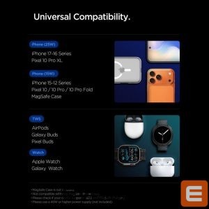 The charger is fully compatible with smartphones equipped with MagSafe magnetic charging technology (iPhone 17-16, Pixel 10 Pro XL support 25W) and with phones with magnetic MagSafe cases or stickers (iPhone 15-12, Pixel 10/10 Pro/10 Pro Fold support 15W).