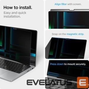 The Spigen SafeView screen protector is a magnetic privacy filter. Thanks to its innovative, adhesive-free installation system, the film combines privacy protection with the convenience of everyday use and environmental friendliness.