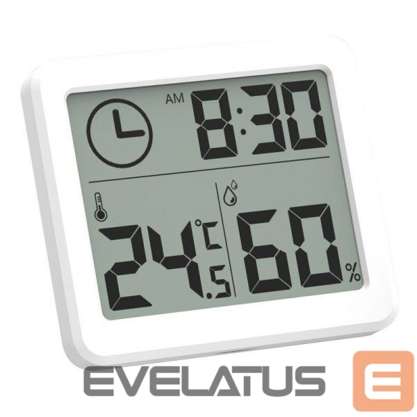 A small, white device that shows the current temperature and humidity level in the room. It also shows  time. It will fit perfectly into the interior of your home, you will be able to place it on a table, cabinets with a leg or stick it to any other surface with a sticker that you will find in the package