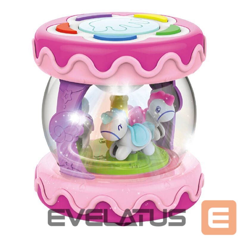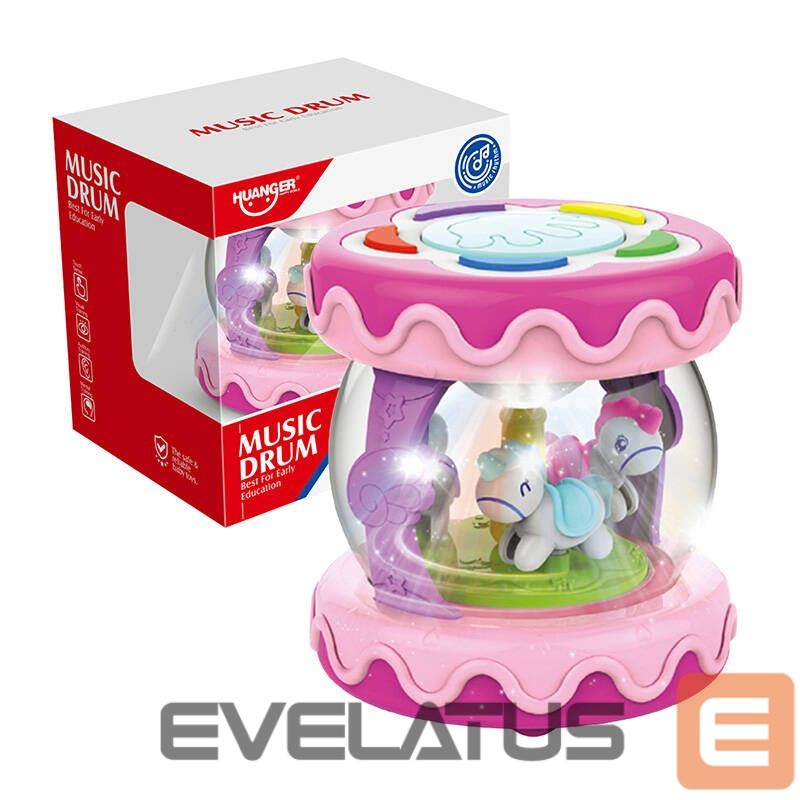 The Huanger HE0702 Musical Drum is a 3-in-1 toy that combines the functions of a drum, music box and projector. This allows the child to enjoy a variety of play activities that develop the senses and promote learning. As a drum, it encourages rhythmic play, developing motor skills and coordination. In music box mode, the spinning horses and melodies create a relaxing atmosphere, ideal for falling asleep. And as a projector, the drum turns the night sky into a fabulous light show, imitating the stars and creating a calming mood. In addition, the toy is equipped with five sound buttons that offer a variety of functions, including drum beats, percussion melodies, animal sounds, volume control, and fun melodies and rhymes.