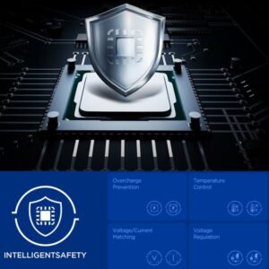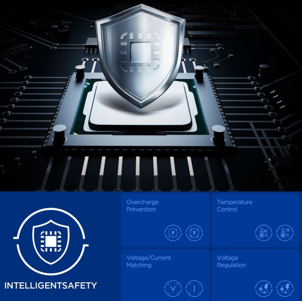 Quantum Boost technology automatically adjusts charging power to match connected devices, maximizing their efficiency. Built-in Overcharge Prevention, Voltage Matching, and Voltage Regulation features protect devices against overcharging, excessive voltage, and unstable current, ensuring safe and stable charging in all conditions.