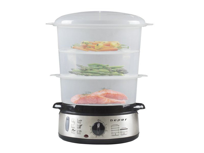 Elektriskais tvaicētājs  no nerūsējošā tērauda bāze un 3 BPA  plastmasas trauki, kas ir caurspīdīgi, lai redzētu gatavošanas gaitu.